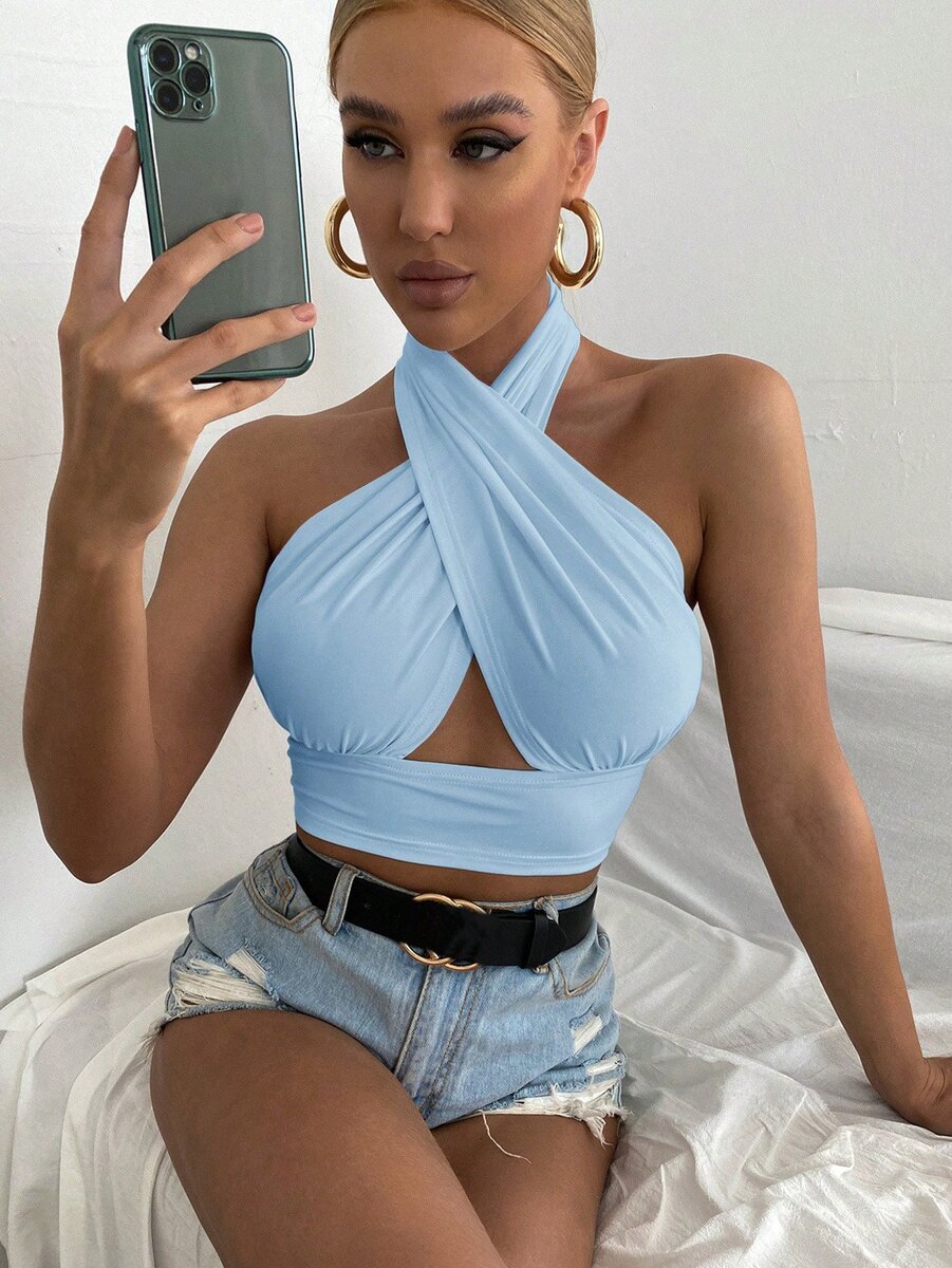 Découvrez ce top croisé bleu élégant pour femme, parfait pour les soirées d'été ou les sorties décontractées. Fabriqué dans un tissu léger et confortable, il s'ajuste parfaitement à votre silhouette. Un choix idéal pour celles qui aiment allier style et confort. Associez-le avec un short ou un jean pour un look tendance.