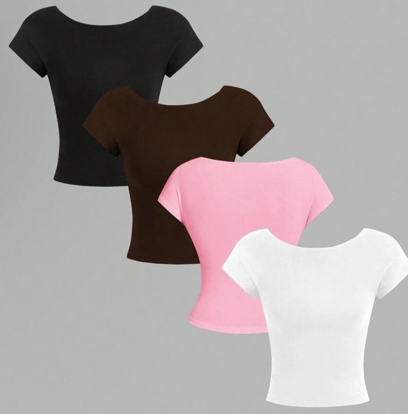 Lot de 4 t-shirts basiques pour femmes, parfaits pour toutes occasions. Disponible en noir, brun, rose et blanc. Confortables et polyvalents, idéals pour un style casual et chic au quotidien.