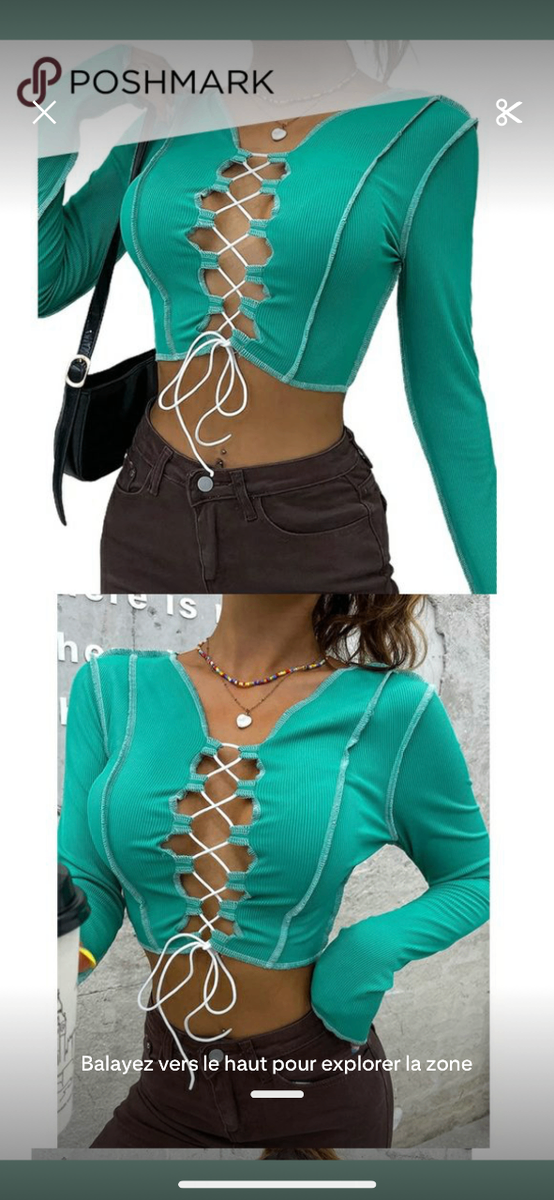 Top vert , décolleté, manche longue , taille s