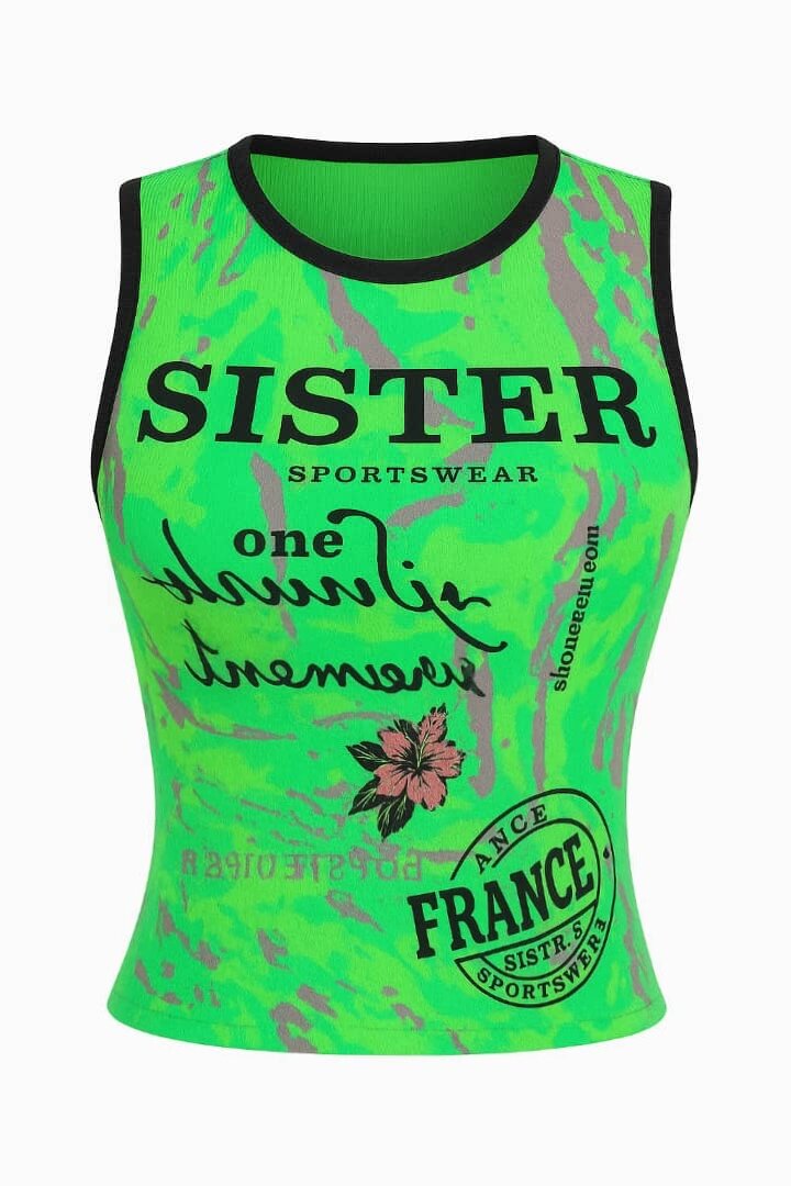 Stand out with this vibrant women's green tank top featuring bold graphics. Perfect for workouts or casual outings, it offers a fashionable and sporty look. Crafted for comfort and style, making it an ideal choice for active women.