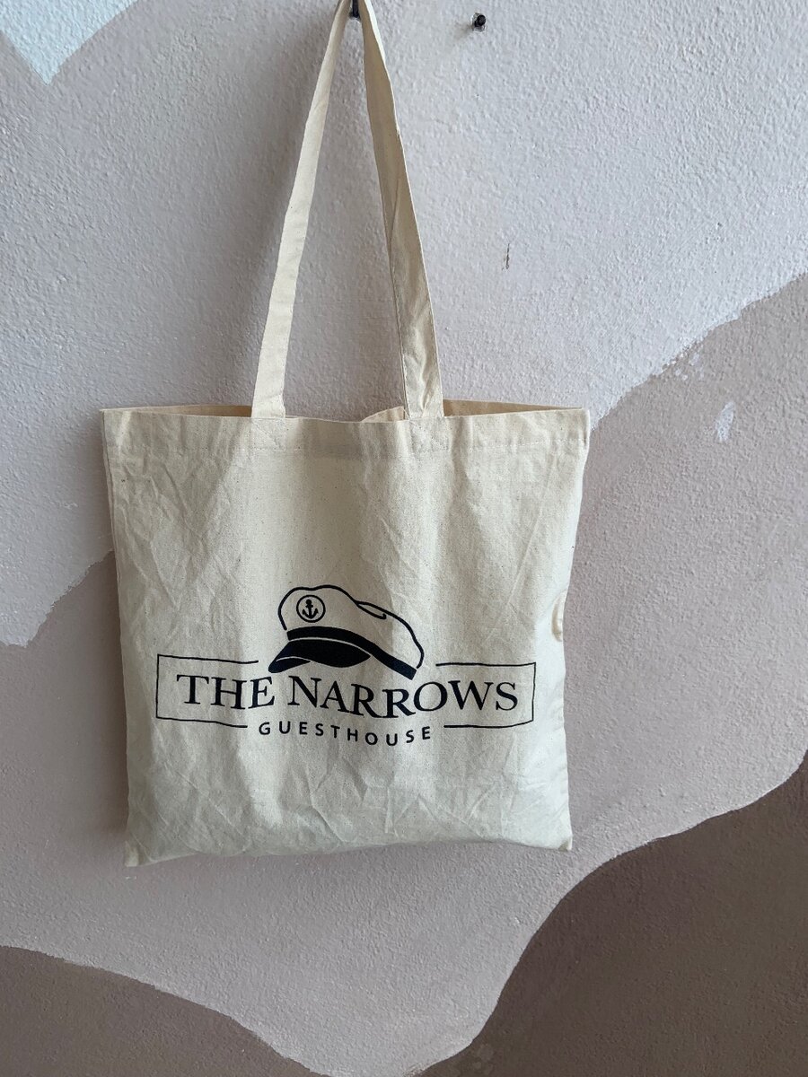 Sac fourre-tout écologique avec imprimé 'The Narrows Guesthouse'. Résistant et idéal pour les courses, voyages ou usage quotidien. Offrez-vous un style unique et pratique.