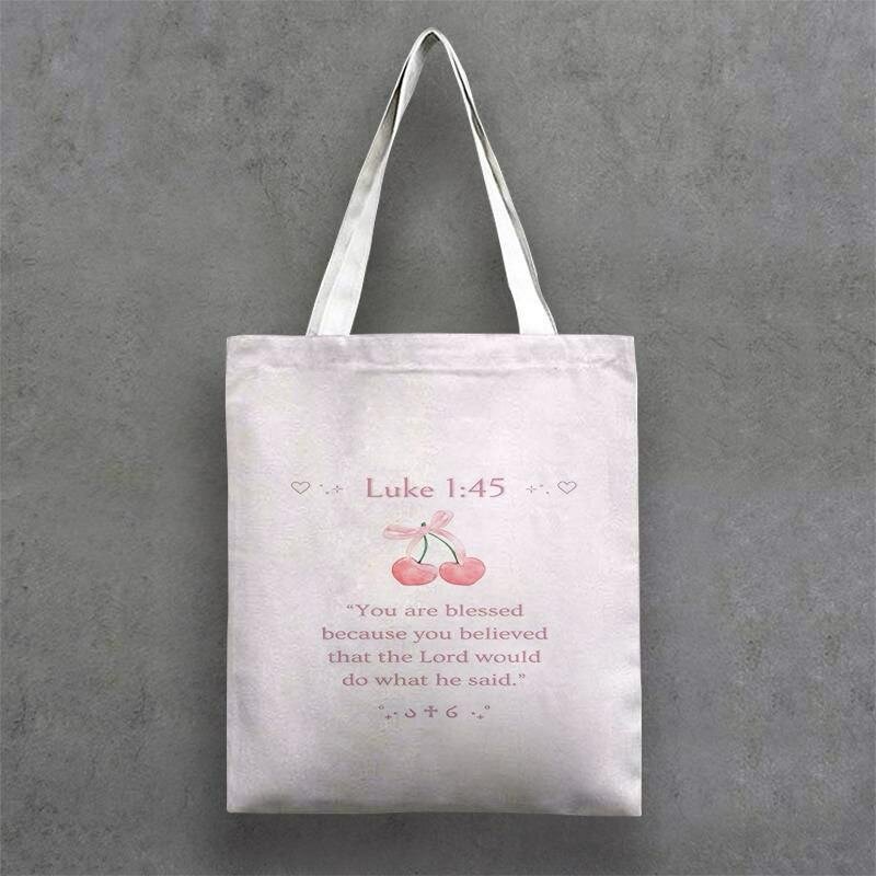 Sac en toile avec imprimé inspirant Luke 1:45. Idéal pour courses, plage ou usage quotidien. Léger et durable.