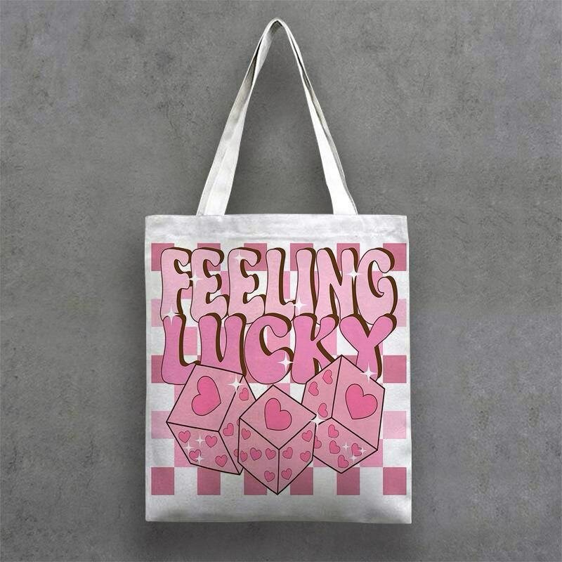 Emportez ce sac tendance "Feeling Lucky" partout avec vous. Fabriqué en matériau robuste, il est idéal pour le shopping ou une sortie entre amis. Son design unique avec dés et cœur attire l'œil et ajoute une touche fun à votre style. Parfait pour un usage quotidien ou comme cadeau original!