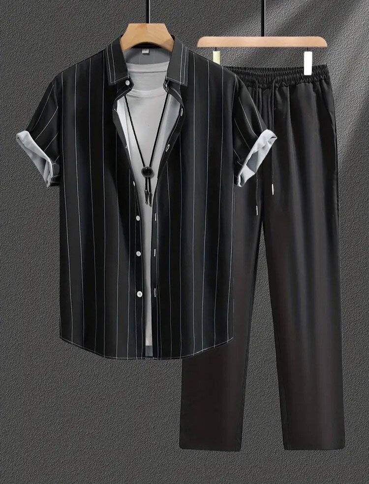 Summer Men's Casual Fashion Digital Print Short Sleeve Shirt and Black Trousers Set