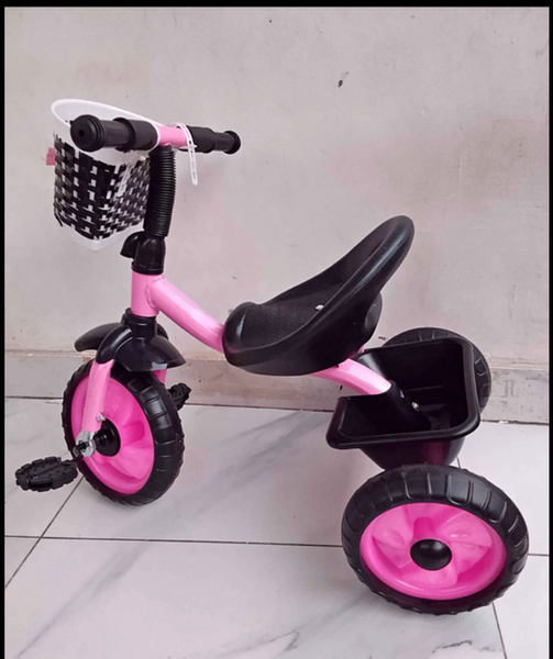 Tricycle pour enfants avec cadre rose vibrant et un panier pratique à l'avant. Idéal pour des balades en sécurité dans le parc, ce tricycle encourage le développement de l'équilibre et la coordination chez les jeunes enfants. Parfait pour les enfants en bas âge, il offre stabilité et confort grâce à son siège ergonomique et ses grandes roues antidérapantes.