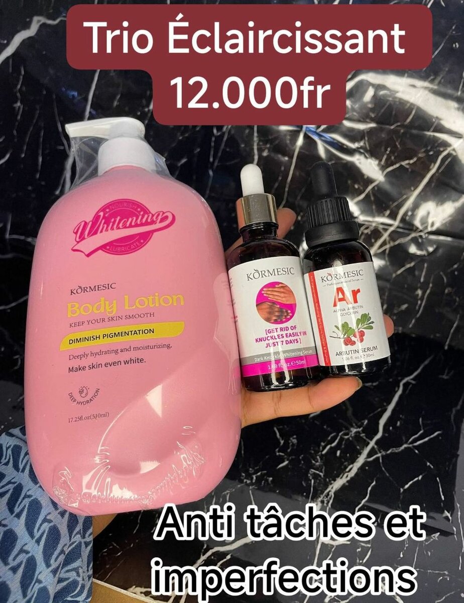 Trio sans tâche, lait corporel+ sérum visage+ sérum articulations sombres