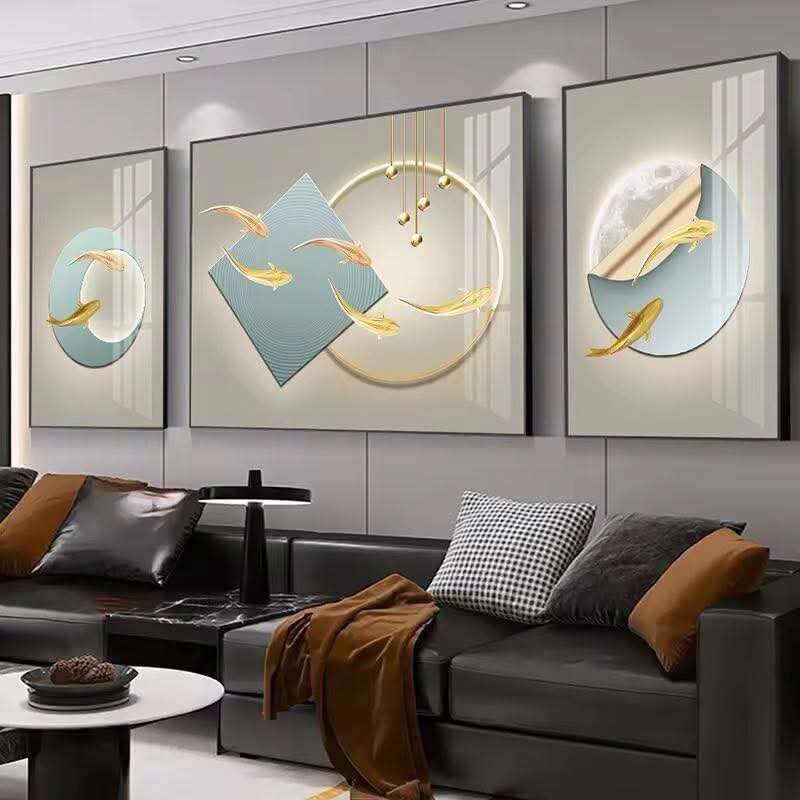 Ajoutez une touche d'élégance moderne à votre intérieur avec ce triptyque mural avec motifs de poissons dorés. Parfait pour le salon ou le bureau, il crée une ambiance sereine et sophistiquée.