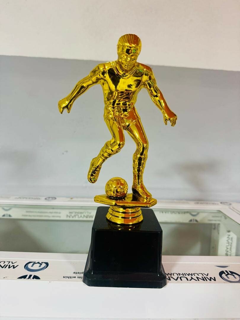 Récompensez vos succès sportifs avec ce Trophée de Football Doré. Avec un design élégant de joueur et de chaussure, il est parfait pour les tournois de football, les événements d'équipes ou comme cadeau pour les passionnés de sport.