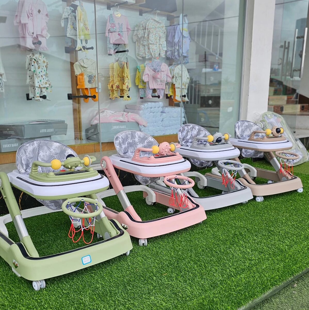 Trotteur interactif pour bébé, avec siège confortable et jouets. Comprend un panier de basketball pour développer la motricité. Léger et facile à manœuvrer.