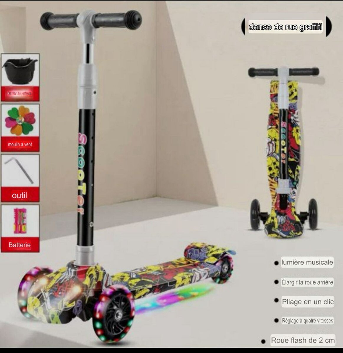 Trottinette pour enfants au design graffiti vibrant. Équipée de roues lumineuses et ajustable en hauteur. Facile à plier pour un transport pratique. Parfaite pour ajouter une touche de fun aux balades.