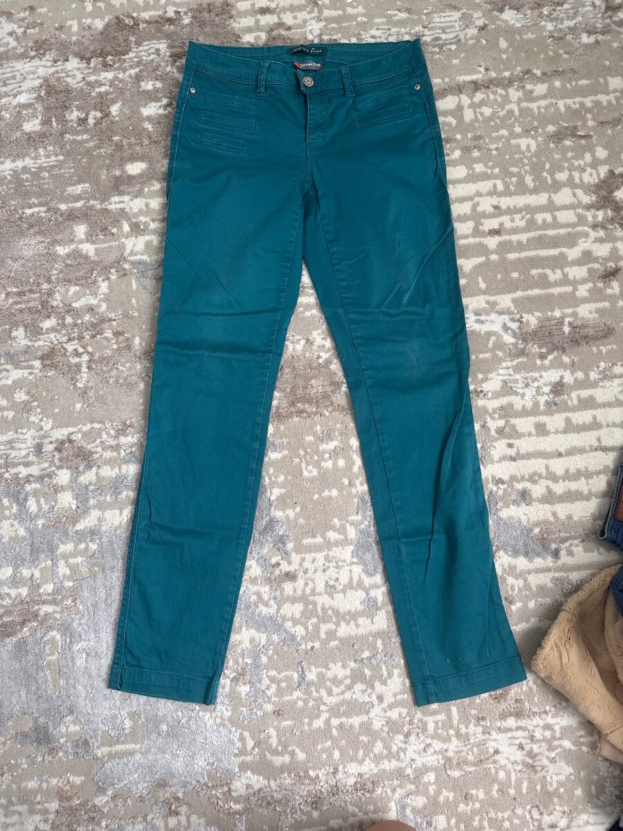 . Джинсы свободного кроя (чуть шире, чем скинни), приятного бирюзового цвета. Удобные и стильные, выделяются на фоне обычных джинс благодаря яркому, но не кричащему оттенку. Сидят комфортно, хорошо смотрятся с базовыми футболками, рубашками или свитерами. Состояние хорошее, без повреждений.