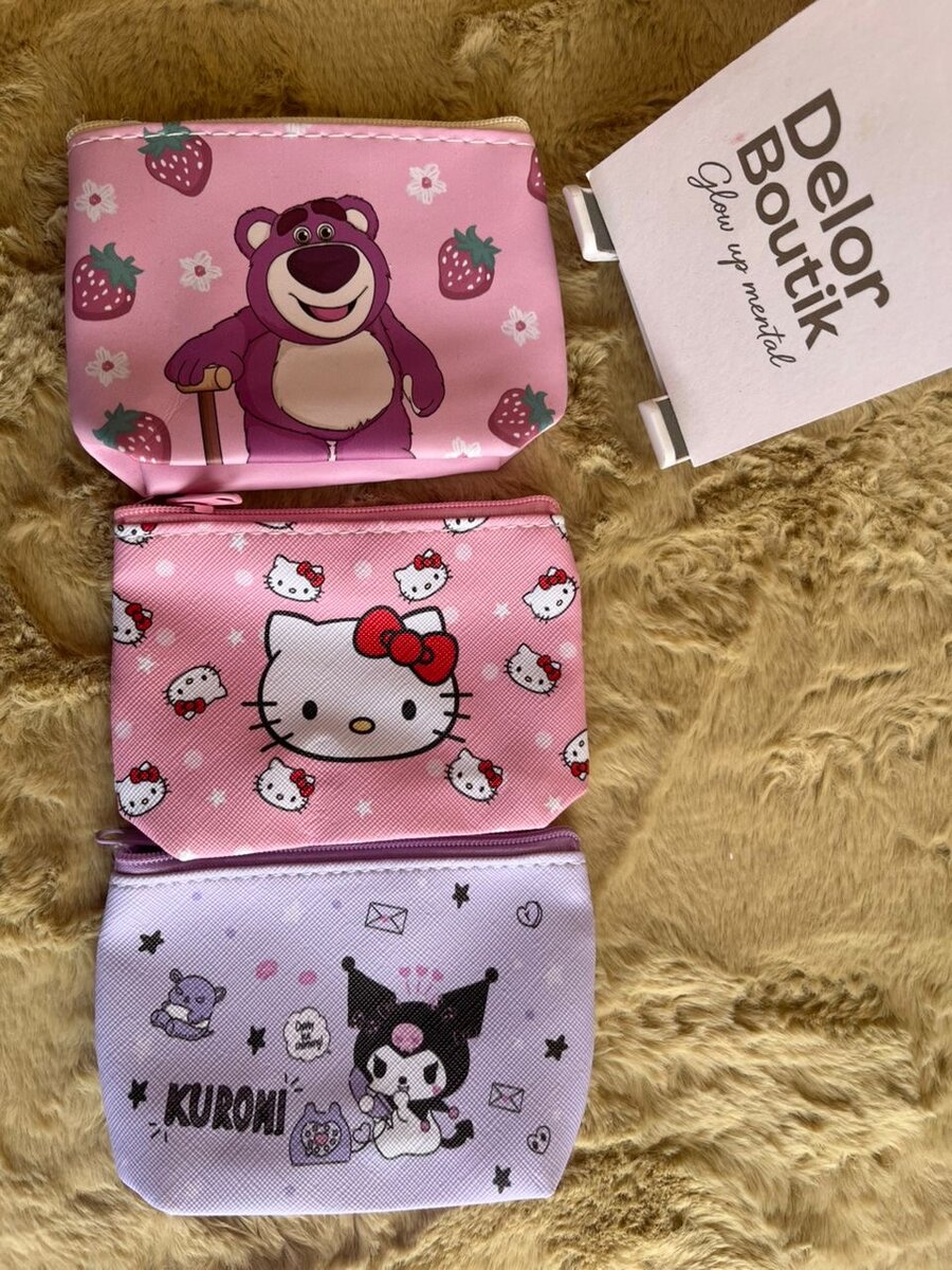 Ensemble de trois trousses kawaii avec motifs adorables, idéal pour organiser vos cosmétiques ou petits accessoires. Parfait pour les fans de mignonnerie!