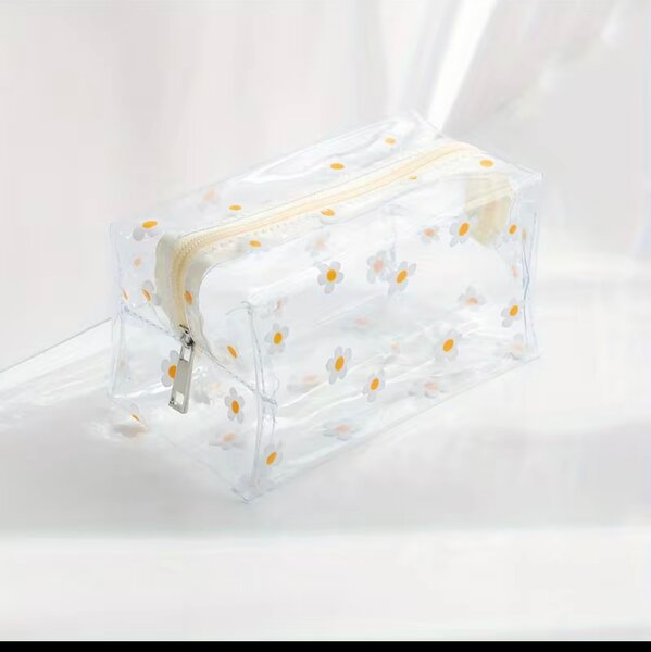 Trousse de maquillage transparente élégante avec paillettes dorées. Idéale pour organiser vos cosmétiques et facile à nettoyer. Format compact, parfait pour le voyage ou le sac à main. Un choix chic pour garder vos essentiels beauté à portée de main.