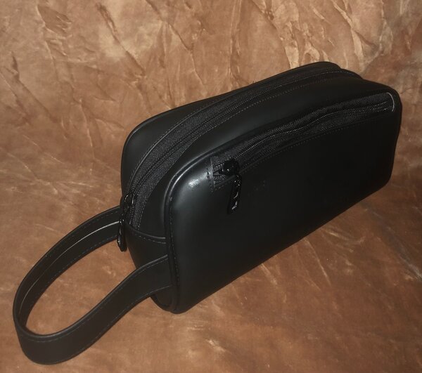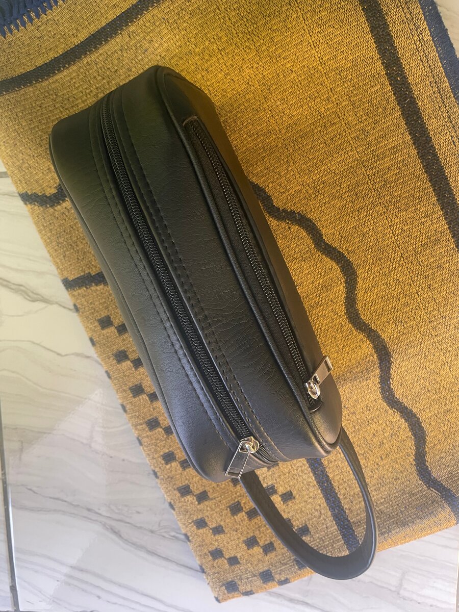 Cette trousse / sacoche en cuir noir est idéale pour organiser vos essentiels de voyage. Avec ses deux compartiments zippés et sa poignée pratique, elle offre une solution élégante et fonctionnelle pour vos produits de soins. Parfaite pour les déplacements professionnels ou les vacances, elle garantit style et durabilité.