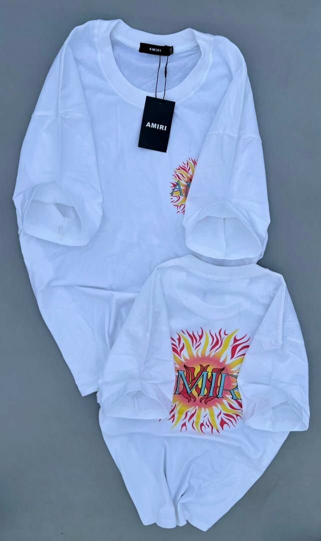 T-shirt blanc Amiri avec motif vibrant de flammes, idéal pour un look décontracté et branché. Fabriqué en coton de qualité, il offre confort et durabilité. Parfait pour les sorties entre amis ou les journées détendues. Exprimez votre style avec originalité.