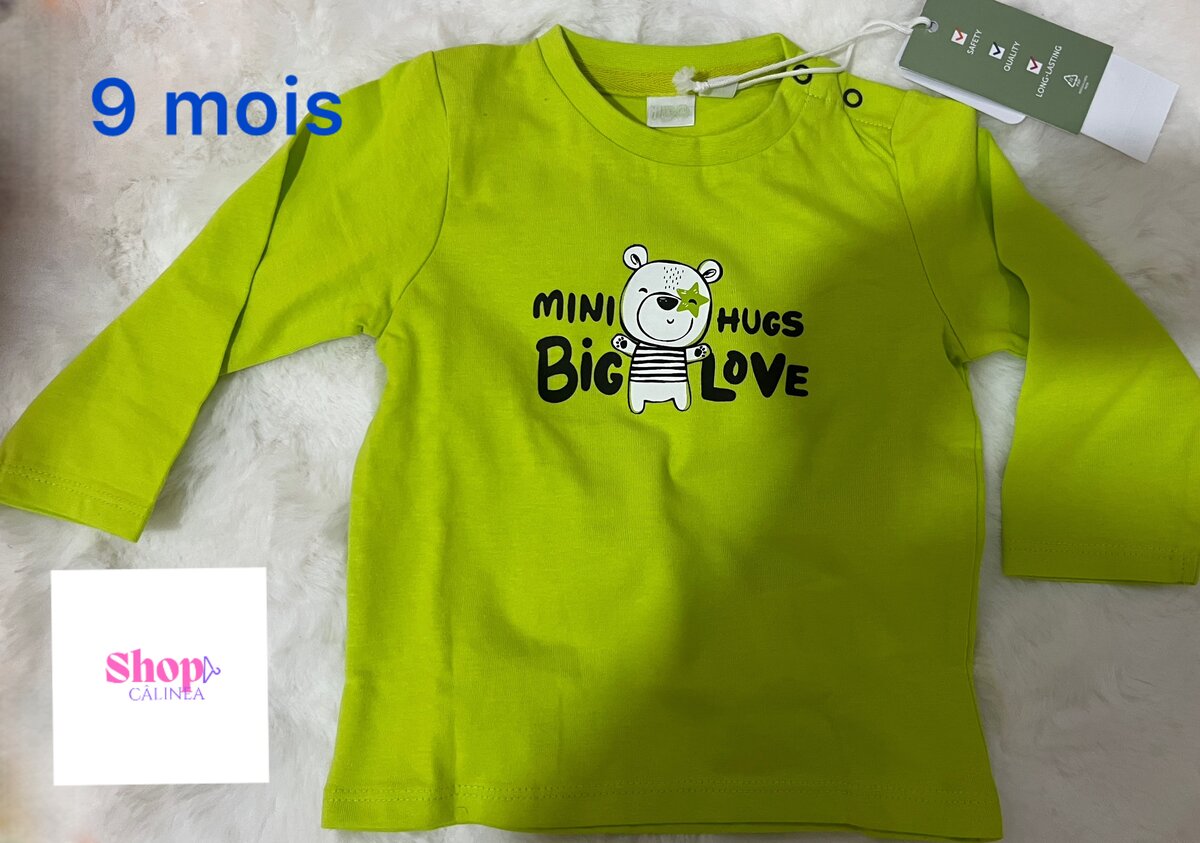 Ajoutez une touche de gaieté à la garde-robe de votre bébé avec ce T-shirt vert vif "Big Love", parfait pour les tout-petits de 9 mois. Fabriqué en coton doux, il garantit confort et style au quotidien. Idéal pour des journées de jeu ou des sorties en famille, ce haut est un incontournable pour un look mignon et décontracté.