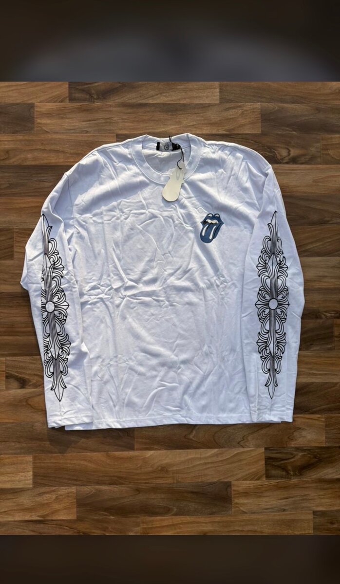 T-shirt blanc à manches longues avec design floral sur les manches et motif graphique sur la poitrine. Parfait pour un style décontracté ou les fans de musique.
