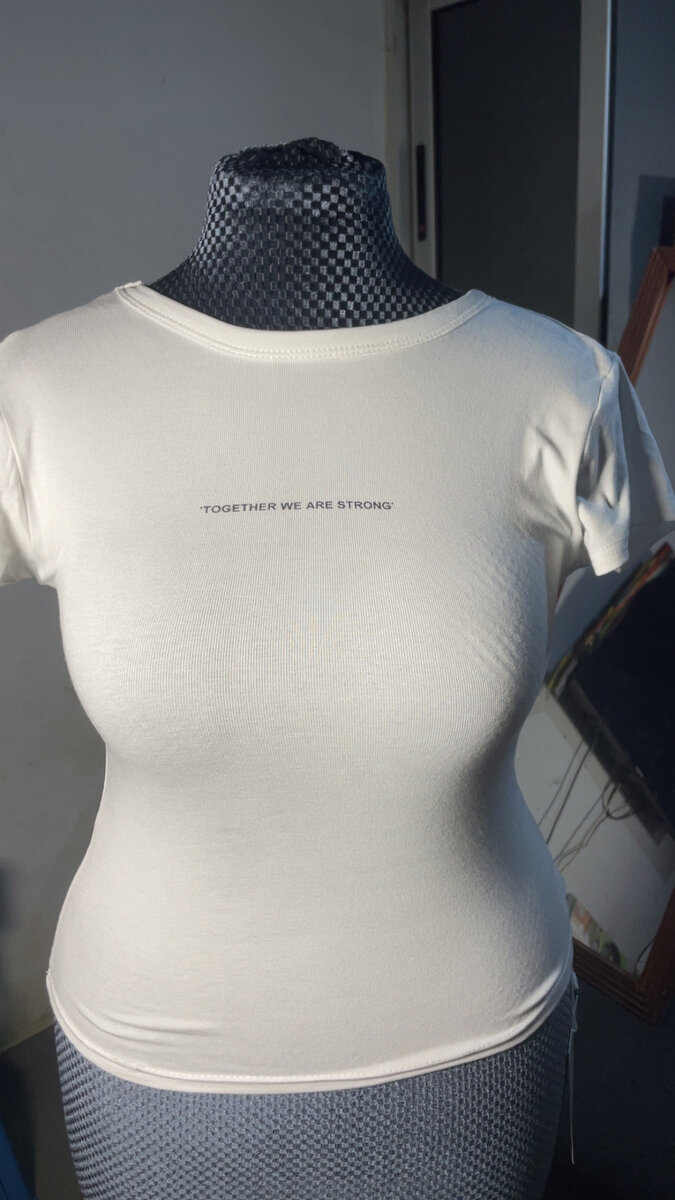 Découvrez notre élégant t-shirt blanc avec le message inspirant "Together We Are Strong". Confortable et stylé, parfait pour toutes vos occasions décontractées. Fabriqué en coton de haute qualité pour une douceur incomparable.