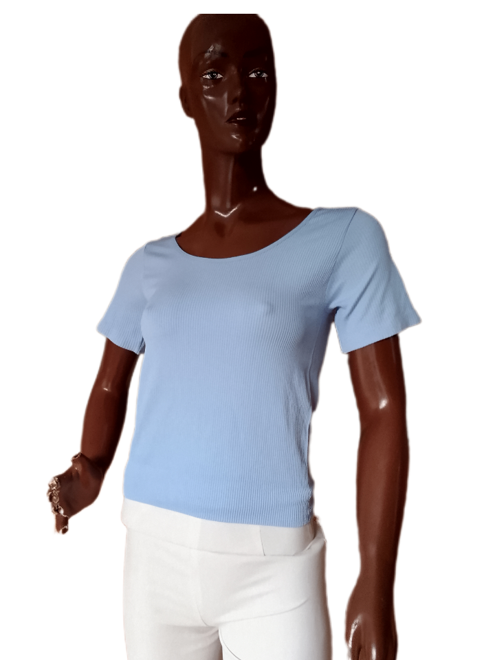T-shirt bleu clair pour femme, idéal pour un look décontracté. Fabriqué en matériau doux et respirant, parfait pour l'été. Associe confort et style, essentiel pour toute garde-robe moderne.