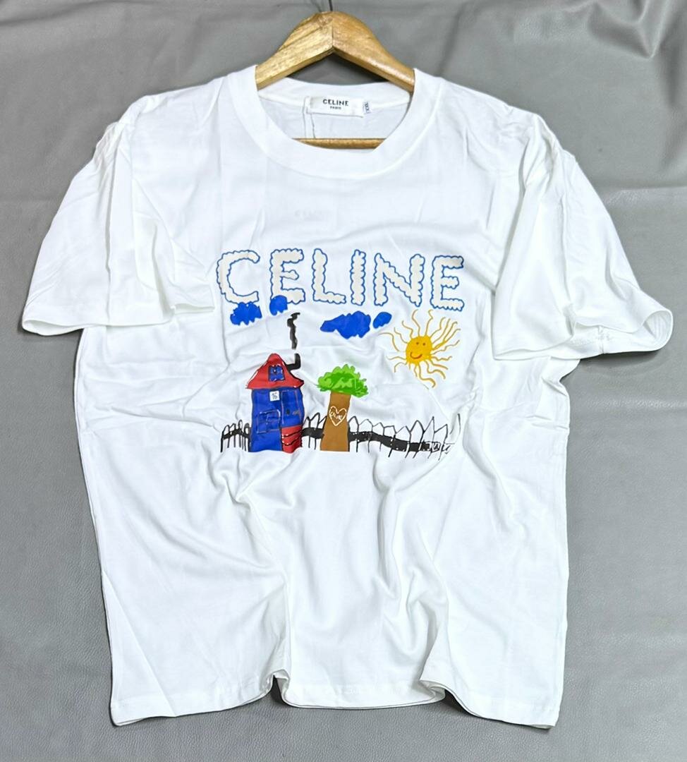 Découvrez ce magnifique t-shirt CELINE blanc à manches courtes, orné d'un motif brodé représentant une scène champêtre avec une maison, un arbre et un soleil. Conçu pour les femmes, ce t-shirt est idéal pour un look décontracté et élégant. Fabriqué avec soin, il offre un confort optimal pour toutes les occasions.