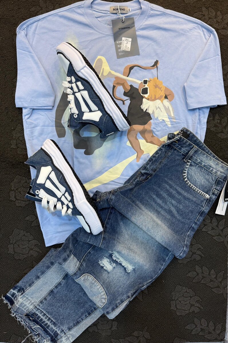 Un ensemble tendance composé d'un t-shirt graphique et d'un short en jean décontracté. Parfait pour un look estival décontracté.