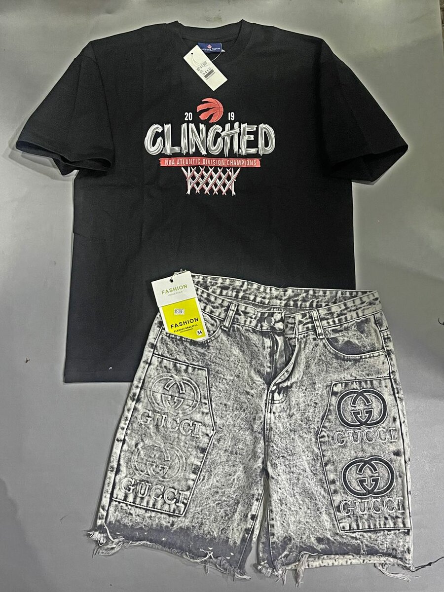 Ensemble tendance avec t-shirt imprimé basket et shorts en jean délavé. Idéal pour un look décontracté et stylé lors des sorties entre amis. Confortable et à la mode, parfait pour les amateurs de mode urbaine.