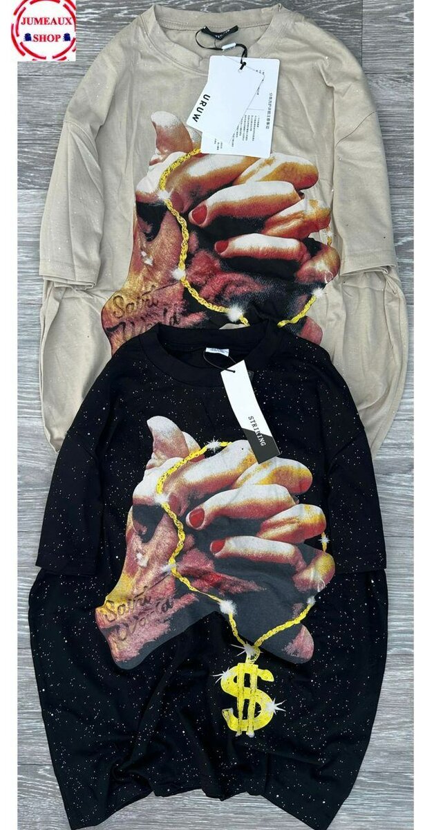 T-shirt oversize avec imprimé artistique de mains et pendentif $. Style urbain et moderne. Matière confortable, idéale pour un look décontracté et affirmé. Disponible en plusieurs couleurs.