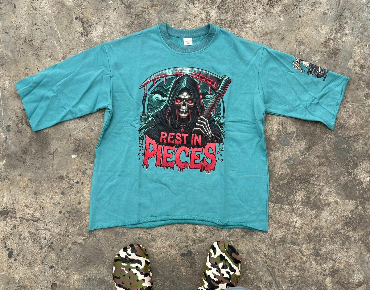 T-shirt homme en coton avec design gothique 'Rest in Pieces'. Idéal pour les amateurs de style alternatif. Confortable et original, parfait pour un look unique et audacieux.