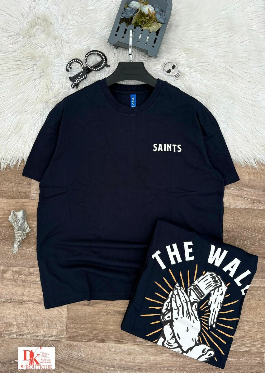 T-shirt noir pour homme avec imprimé original 'SAINTS' à l'avant et design artistique au dos. Idéal pour un style décontracté ou urbain. Confortable et contemporain, parfait pour toutes les saisons.