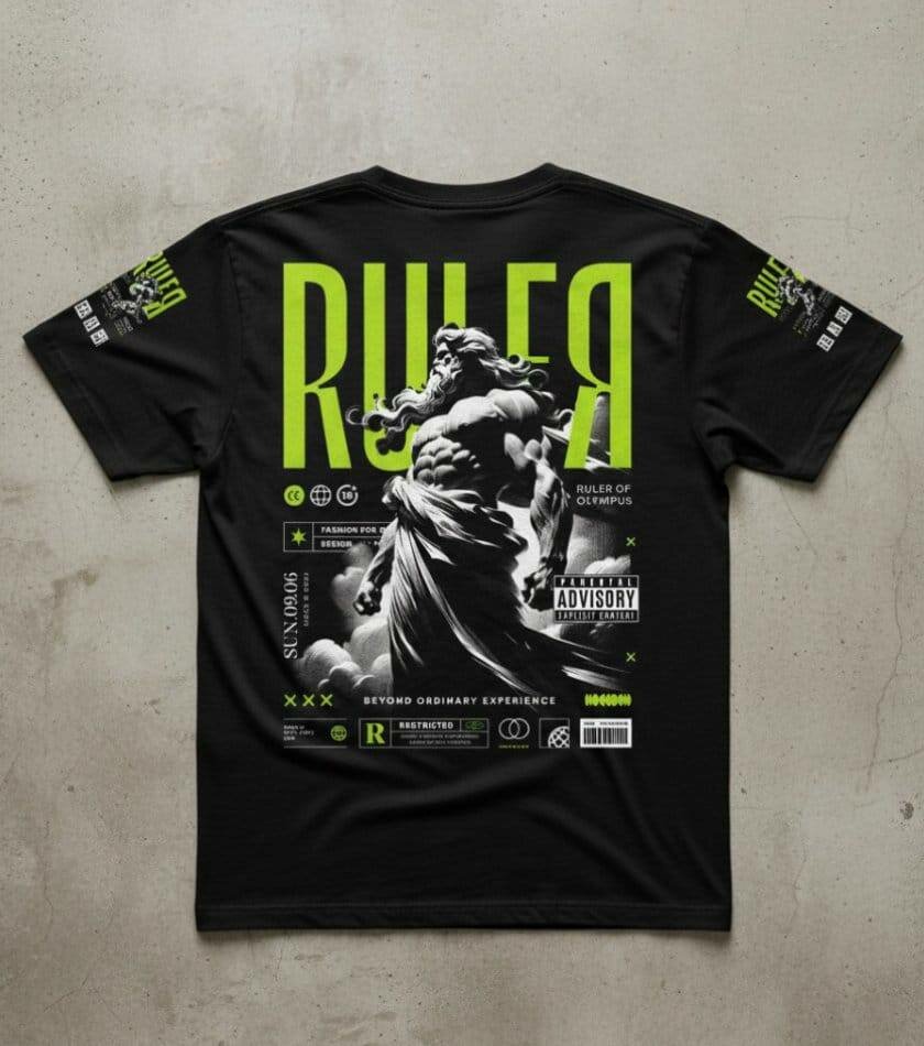 T-shirt noir pour homme avec un design graphique saisissant. Le motif RULE9 est imprimé en vert sur le devant, accompagné d'une illustration en noir et blanc d'une figure mythologique. Idéal pour les amateurs de mode streetwear, ce t-shirt offre un style unique et décontracté. Fabriqué avec des matériaux confortables, il est parfait pour une utilisation quotidienne.
