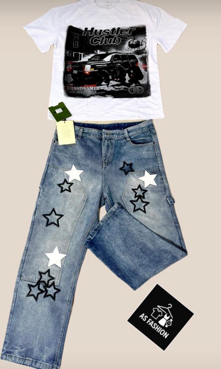 Craquez pour ce combo tendance : un t-shirt blanc à imprimé graphique "Hustler Club" et un jean stylé avec étoiles. Parfait pour un look urbain chic, ce duo allie confort et style. Portez-le pour une sortie entre amis ou une journée décontractée en ville. Le t-shirt en coton offre une sensation douce, tandis que le jean garantit une allure moderne.