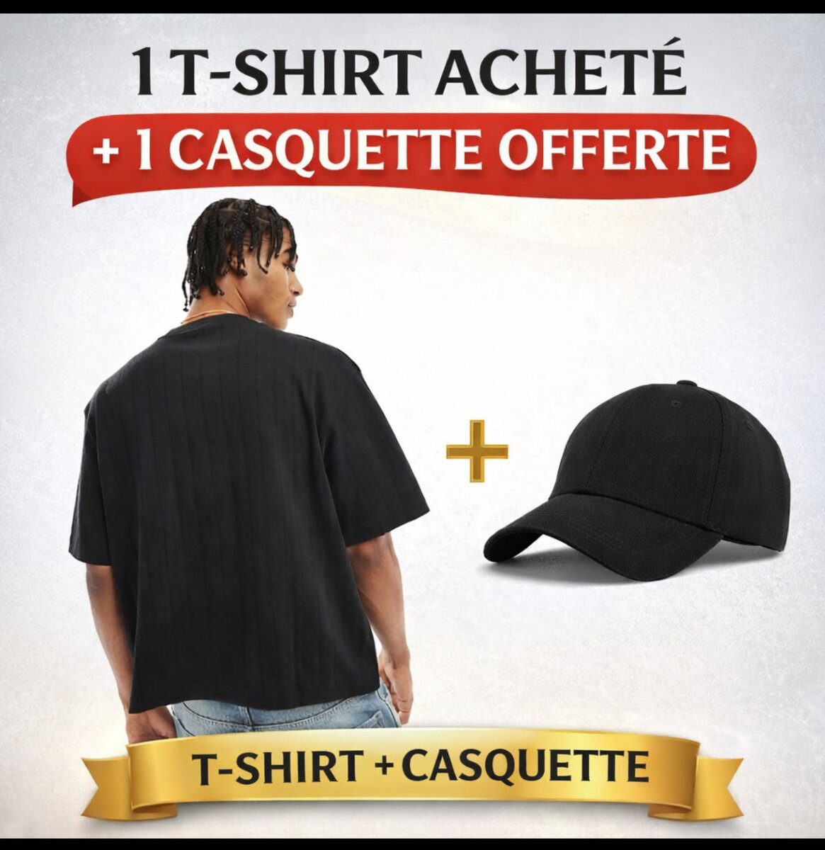 Obtenez un style décontracté avec notre t-shirt noir et la casquette incluse. Idéal pour un look moderne et élégant. Offre spéciale : une casquette offerte pour l'achat d'un t-shirt. Ne manquez pas cette opportunité pour améliorer votre garde-robe !