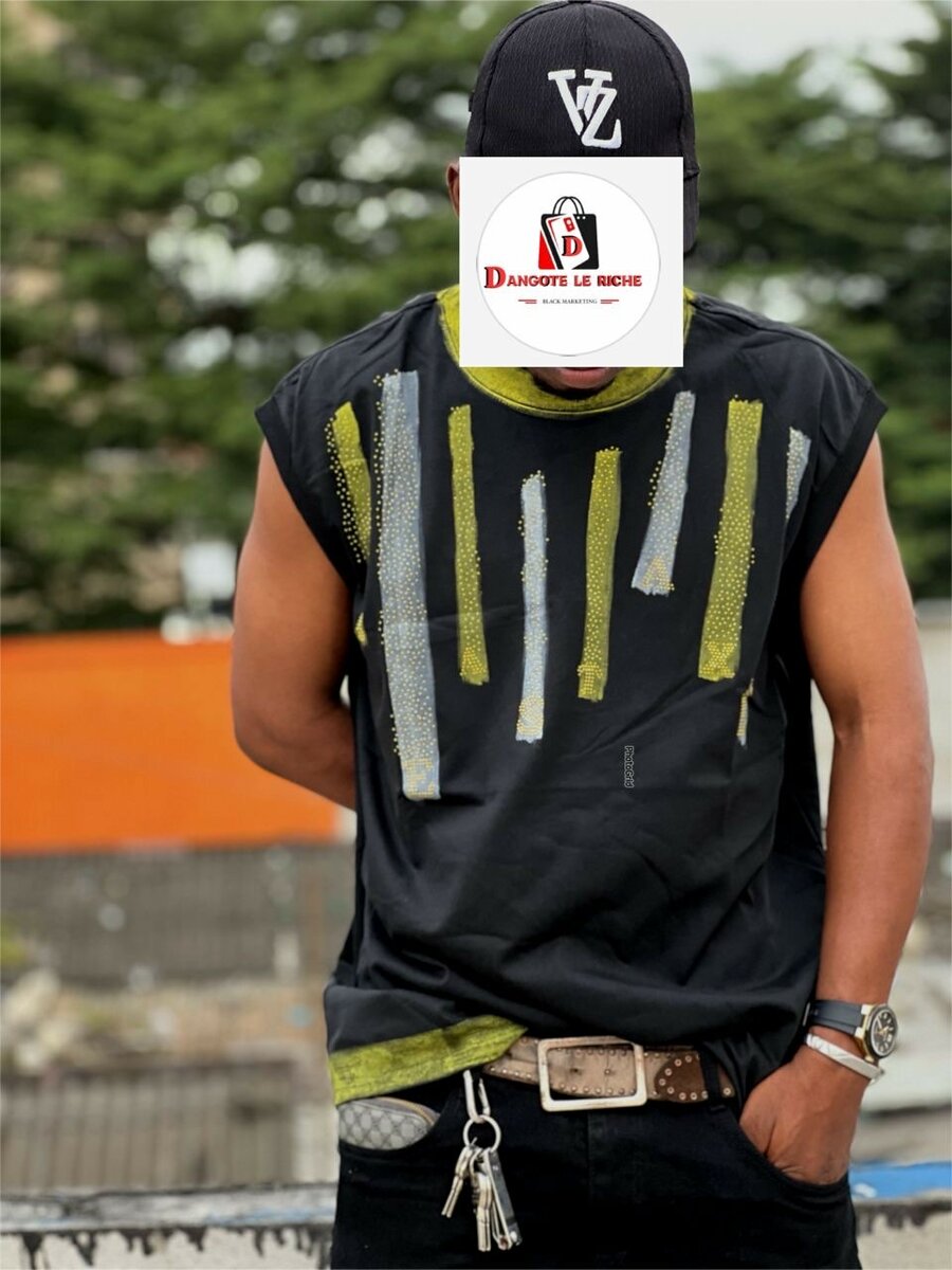 Optez pour ce t-shirt noir audacieux avec un design moderne et unique. Parfait pour un look urbain et tendance, ce haut sans manches est idéal pour les sorties décontractées. Fabriqué avec des matériaux de qualité pour un confort optimal. Associez-le avec un jean pour un style impeccable.
