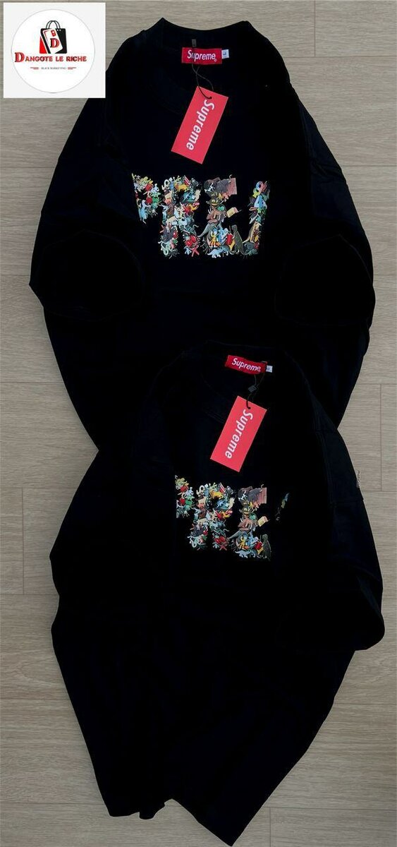 T-shirt noir tendance avec motif floral de marque Supreme. Parfait pour un style urbain et décontracté. Idéal pour les sorties entre amis ou les week-ends relax. Confort et style garantis avec ce t-shirt emblématique.