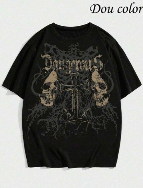 Un T-shirt noir au style gothique, orné de motifs de crâne et de croix pour un look audacieux et unique. Confortable, parfait pour une expression individuelle distinctive.
