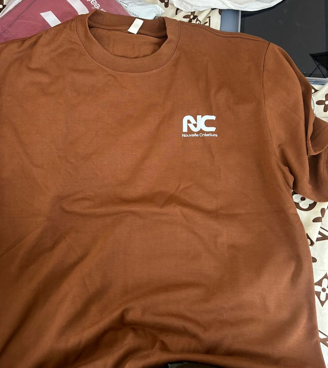 T-shirt marron avec un imprimé " Nouvelle Créature blanc devant et "C'est n'es jamais la chance c'est Toujours Dieu" derrière. Conçu pour un style décontracté et confortable. Idéal pour les amateurs de mode streetwear.