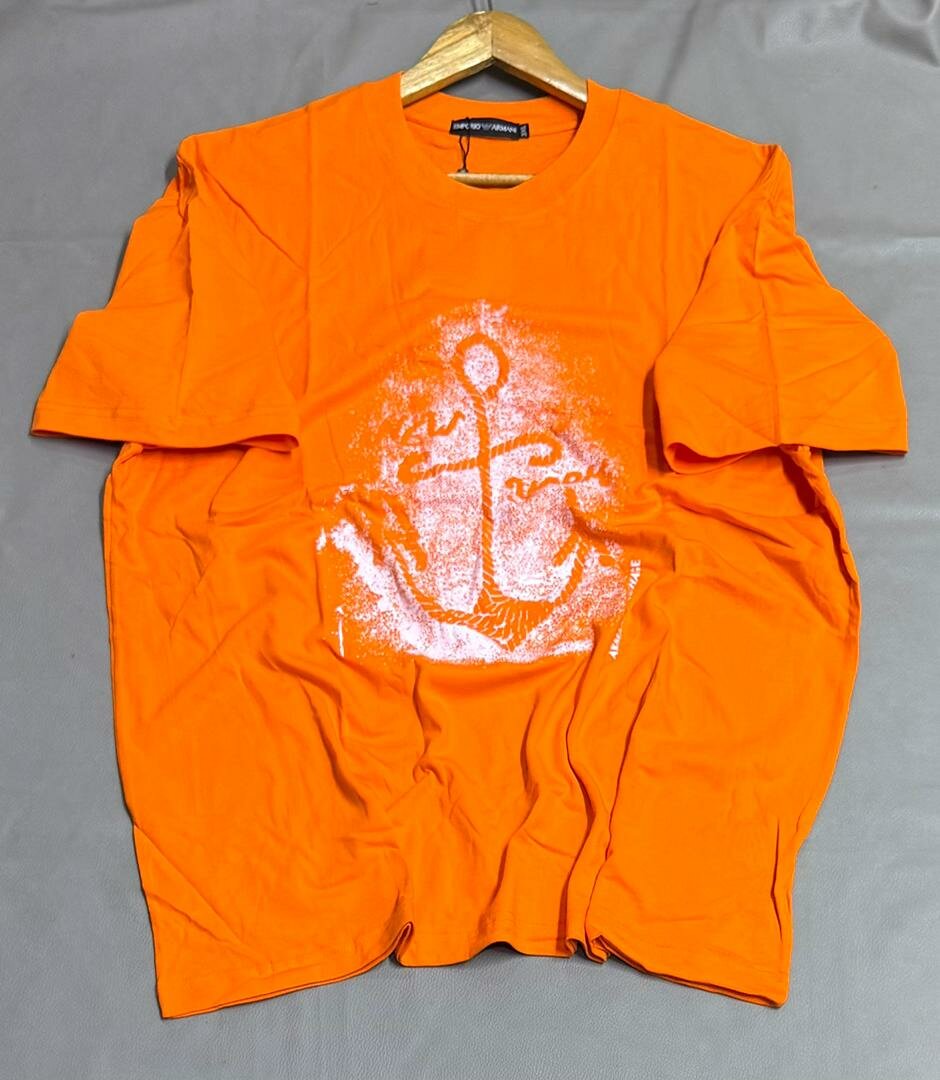 T-shirt orange homme à manches courtes avec motif ancre blanc. Confortable et idéal pour les journées décontractées. Parfait pour les amateurs de style maritime.