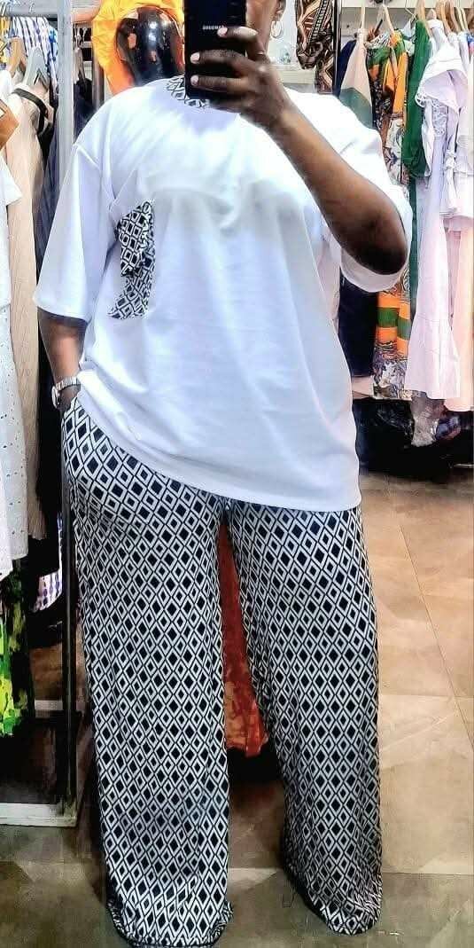 Découvrez cet ensemble chic et confortable avec un t-shirt oversized et un pantalon à motifs géométriques. Idéal pour un look décontracté et tendance, parfait pour toutes les morphologies. Portez-le pour une sortie en ville ou une journée relaxante à la maison.