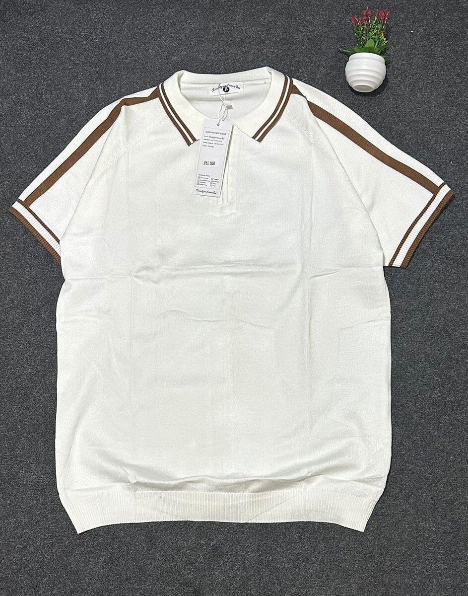 Adoptez un style élégant avec ce t-shirt polo blanc à bandes marron, idéal pour un look décontracté ou professionnel.