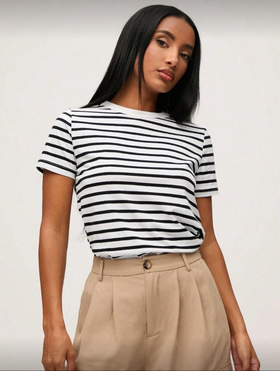 T-shirt rayé noir et blanc intemporel, en coton doux, parfait pour un style décontracté ou élégant. Idéal pour toutes les saisons, facile à assortir avec pantalons ou jupes.