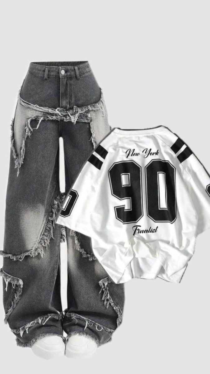 Élancez-vous avec style grâce à ce T-shirt rétro "New York 90" associé à un jeans large et déchiré. Un look parfait pour une allure urbaine et branchée. Idéal pour un style décontracté et tendance !