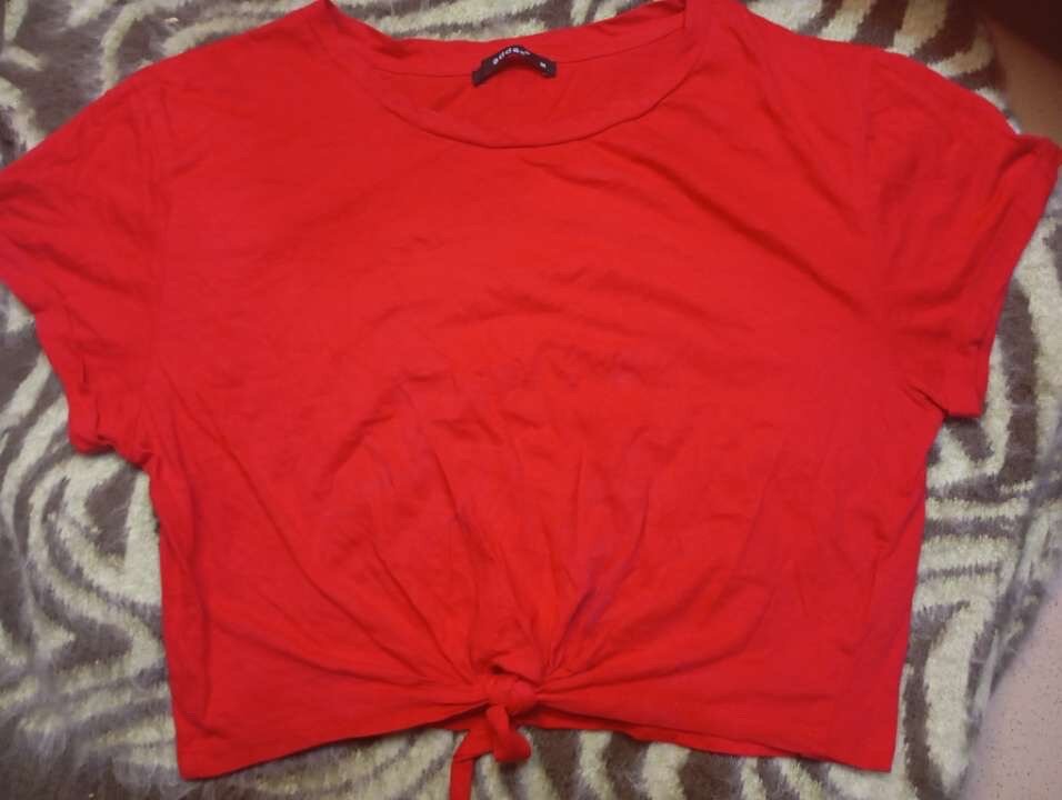 T-shirt rouge vif pour un style décontracté et tendance. Le design court avec un nœud à l'avant ajoute une touche moderne, parfait pour des sorties ou des journées décontractées. Idéal pour associer avec un jean ou une jupe pour un look chic et confortable.