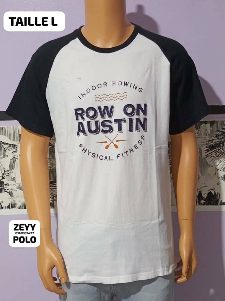 T-shirt confortable en coton avec design "Row on Austin", parfait pour les amateurs de fitness et d'aventure. Taille L. Idéal pour les sessions d'intérieur ou un style décontracté en extérieur.