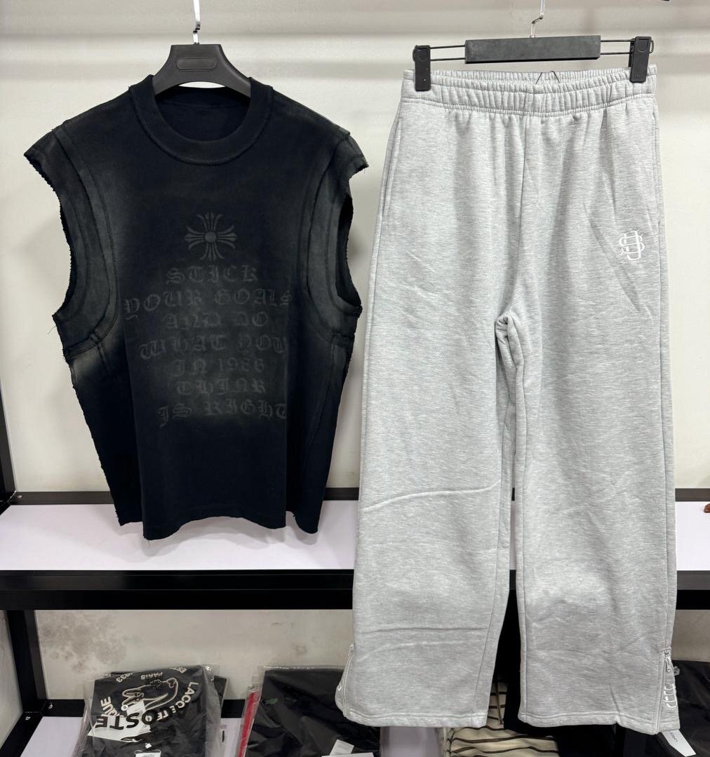 T-shirt noir sans manches avec design audacieux et pantalon de survêtement gris confortable. Parfait pour le style décontracté et les séances d'entraînement. Fabriqué avec des matériaux de qualité pour un confort maximal.