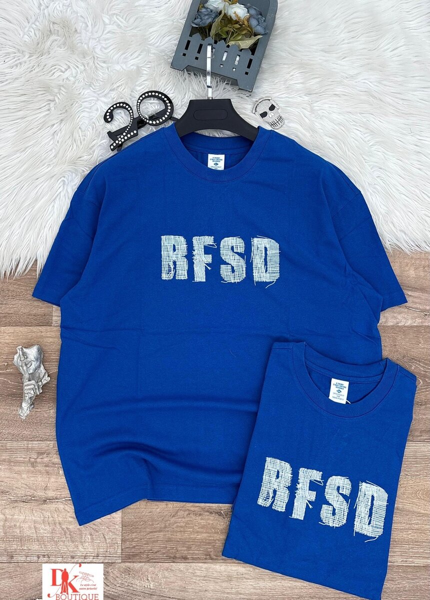 T-shirt unisexe en coton bleu avec design RFSD. Confortable et stylé, idéal pour un look décontracté. Parfait pour hommes et femmes, avec coupe classique. Disponible en plusieurs tailles.
