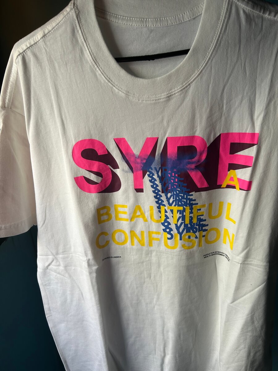 T-shirt unisexe blanc avec motif graphique SYRE, idéal pour les fans de mode contemporaine. Fabriqué en coton doux pour un confort optimal. Parfait pour un look décontracté et stylé.