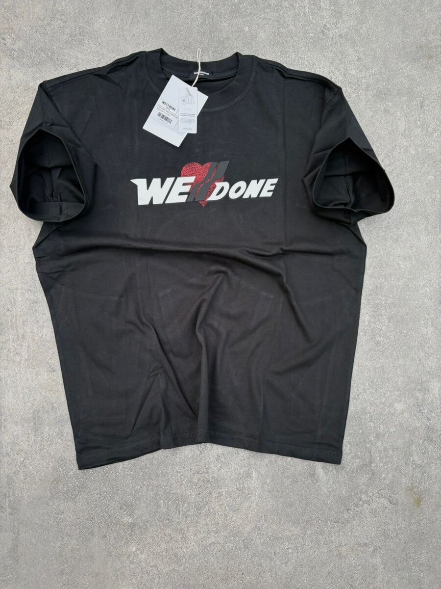 T-shirt noir avec inscription "We Done", parfait pour un look décontracté. Fabriqué en coton de haute qualité pour un confort optimal. Idéal pour les sorties décontractées ou les tenues de tous les jours. Disponible en plusieurs tailles.