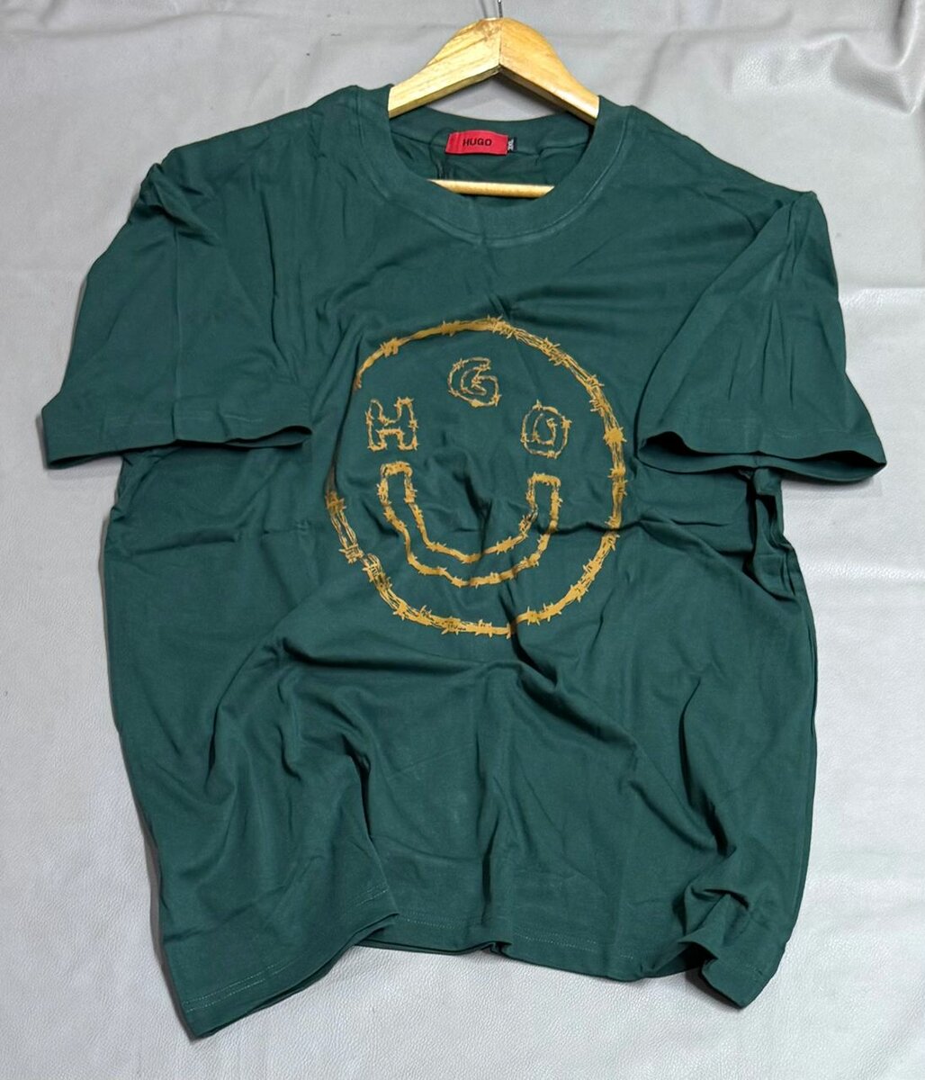 T-shirt vert émeraude avec un grand smiley doré imprimé sur le devant. Conçu en coton de qualité, ce t-shirt est confortable et facile à porter. Idéal pour les fans de designs originaux et décontractés.