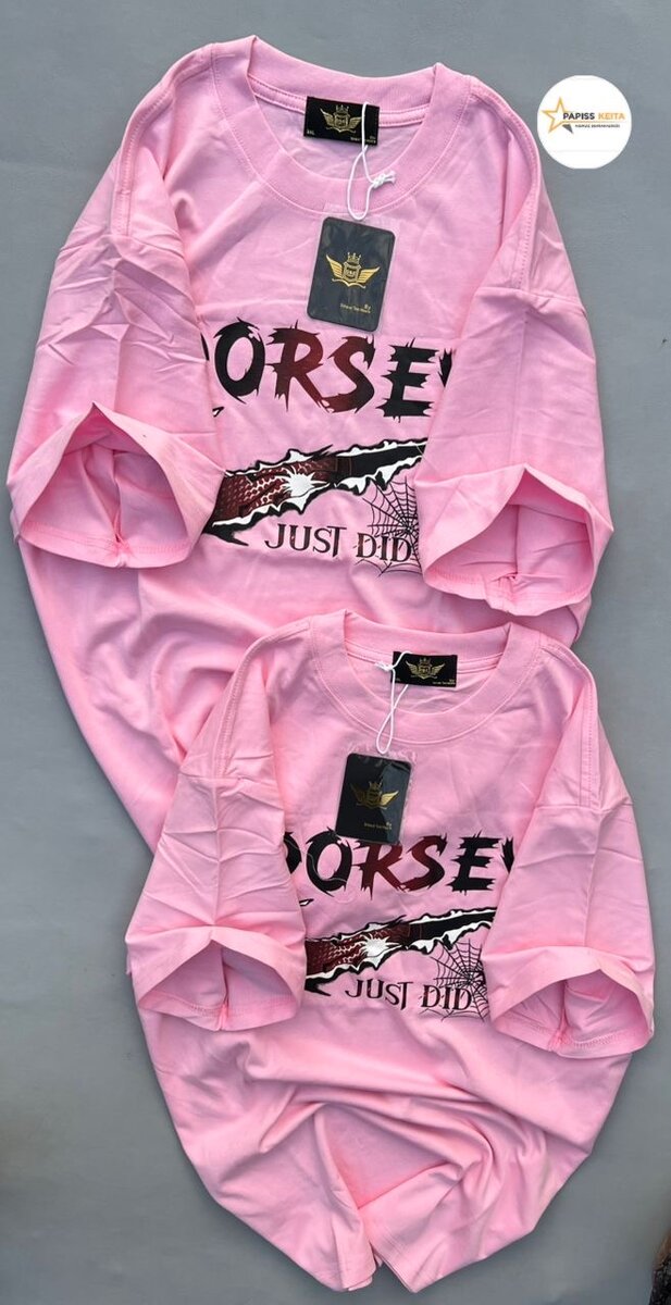 Ensemble de t-shirts roses assortis avec design imprimé audacieux. Parfait pour un look familial coordonné ou des sorties décontractées en duo. Fabriqué en coton doux pour un confort optimal.
