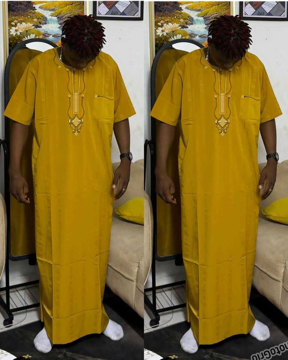 Tunique africaine jaune pour homme, élégante et confortable. Parfaite pour les occasions spéciales ou le quotidien. Confectionnée avec des matériaux de qualité pour un confort optimal.